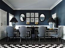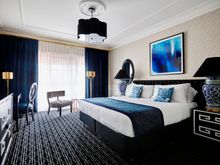 “The overall design is a carefully planned combination of patterns with whites and blues that link back to the common areas of the hotel. The black carpets and rich blue drapes offset the pops of gold the floor lamps and wallpaper. It's very layered and it's very decadent. It transports you to somewhere very much unlike your own bedroom and that's part of the fun of a hotel stay.”