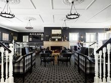 All 70 guestrooms and interior public spaces have been rejuvenated by Greg Natale and his team, combining classic country heritage character with contemporary elegance. Upon arrival, guests are welcomed into an intimate arrivals precinct, complete with Natale's Hudson lounge chairs and tables, and Ralph Lauren lamps. The reception and atrium are coated in Natale's Atlantic Blue wallpaper from Porter's Paints. Continuing up the grand hall, the glass-domed ceiling has now become a classic congregational atrium area with a custom-built circular bench seat – a feature that adds to the drama and sense of arrival.